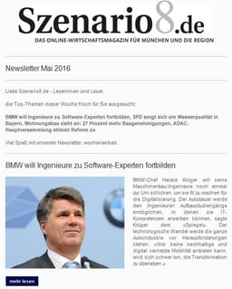 Szenario8.de verschickt in regelmäßigen Abständen Newsletter an viele Entscheider in der Region München. Die Menge der Rezipienten steigt von Monat zu Monat. Empfänger sind Geschäftsführer, Vorstände und Meinungsführer.